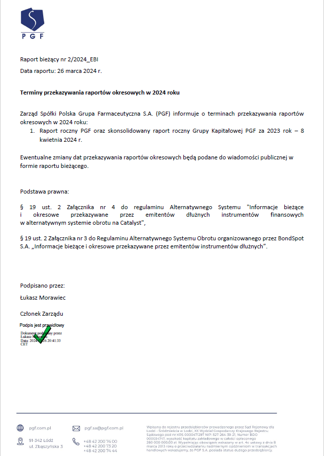 Rejestracja Obligacji w systemie depozytowym prowadzonym przez Krajowy Depozyt Papierów Wartościowych S.A. nastąpiła w dniu 9 września 2022 r. Polska Grupa Farmaceutyczna („PGF”) wyemitowała 130 000 szt obligacji 2-letnich serii C, każda o wartości 1.000 PLN. Obligacje PGF w całości zostały objęte przez instytucje finansowe i trafiły do obrotu wtórnego na Catalyst. Pierwsze notowanie miało miejsce w dniu 16 września 2022 r. Kupony odsetkowe są wypłacane w okresach trzymiesięcznych, oprocentowanie obligacji wynosi WIBOR 3m + marża 2,35 p.p. Termin wykupu obligacji ustalono na 9 września 2024 r.