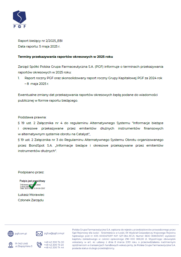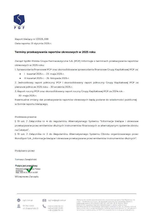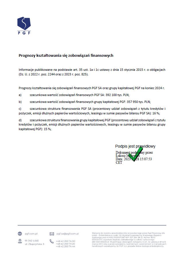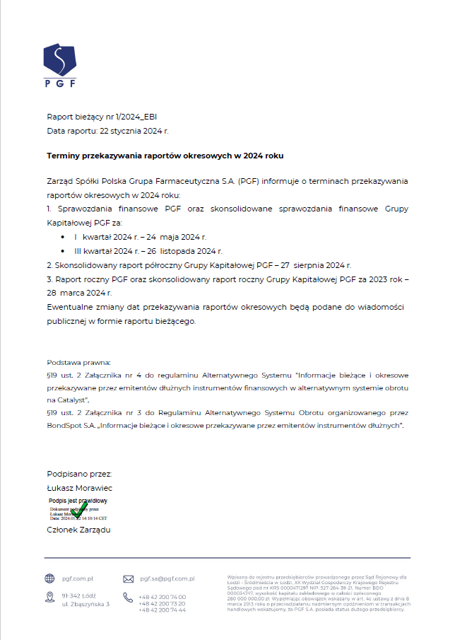 Rejestracja Obligacji w systemie depozytowym prowadzonym przez Krajowy Depozyt Papierów Wartościowych S.A. nastąpiła w dniu 9 września 2022 r. Polska Grupa Farmaceutyczna („PGF”) wyemitowała 130 000 szt obligacji 2-letnich serii C, każda o wartości 1.000 PLN. Obligacje PGF w całości zostały objęte przez instytucje finansowe i trafiły do obrotu wtórnego na Catalyst. Pierwsze notowanie miało miejsce w dniu 16 września 2022 r. Kupony odsetkowe są wypłacane w okresach trzymiesięcznych, oprocentowanie obligacji wynosi WIBOR 3m + marża 2,35 p.p. Termin wykupu obligacji ustalono na 9 września 2024 r.